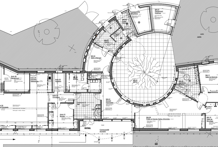 L'idée du projet : offrir au multi accueil « un cocon maternel » autour d’un patio extérieur intime et offrir aux autres types d’accueils « une ouverture sur l’extérieur ».